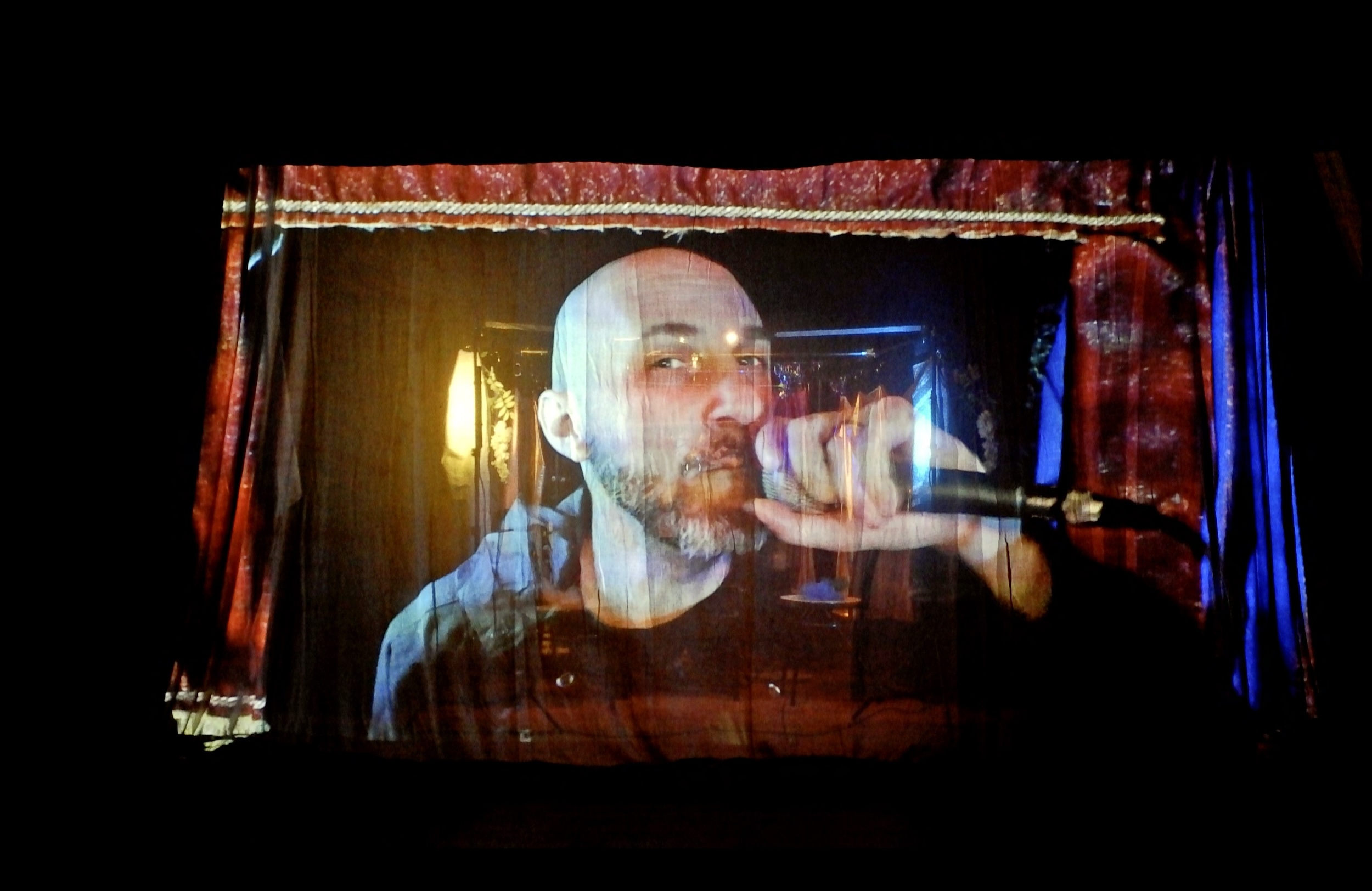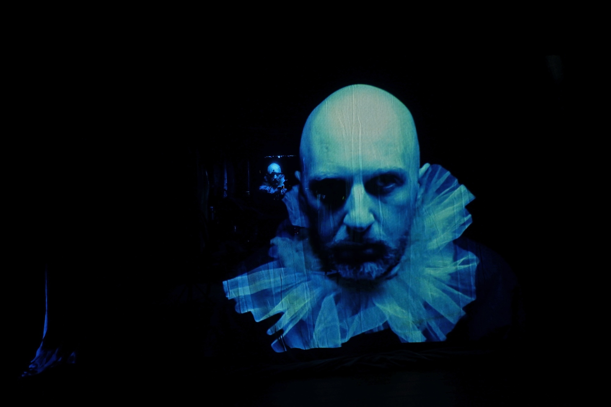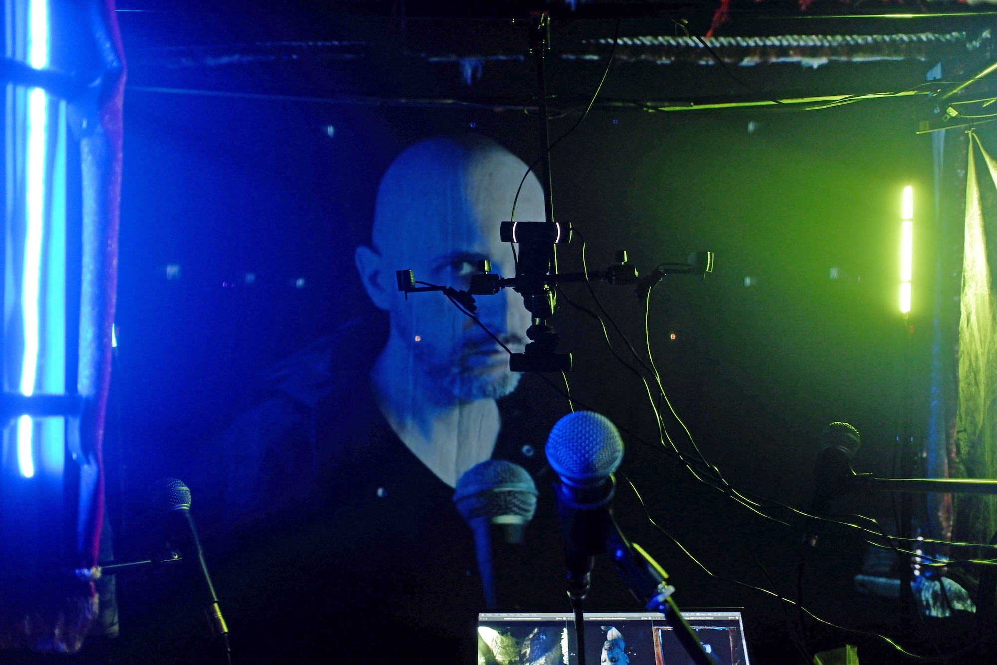 Sul palco, le telecamere svelano ciò che accade in tempo reale: il conduttore e gli ospiti di una misteriosa celebrazione, trasmessa in diretta su un grande schermo, come un film che si scrive sotto gli occhi dello spettatore.