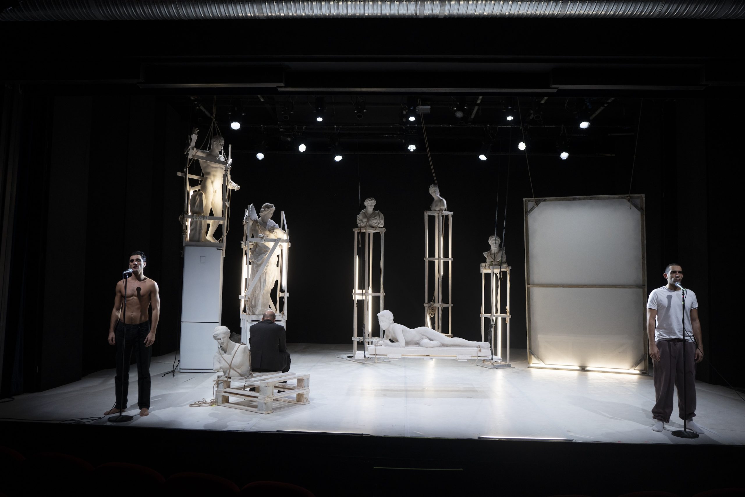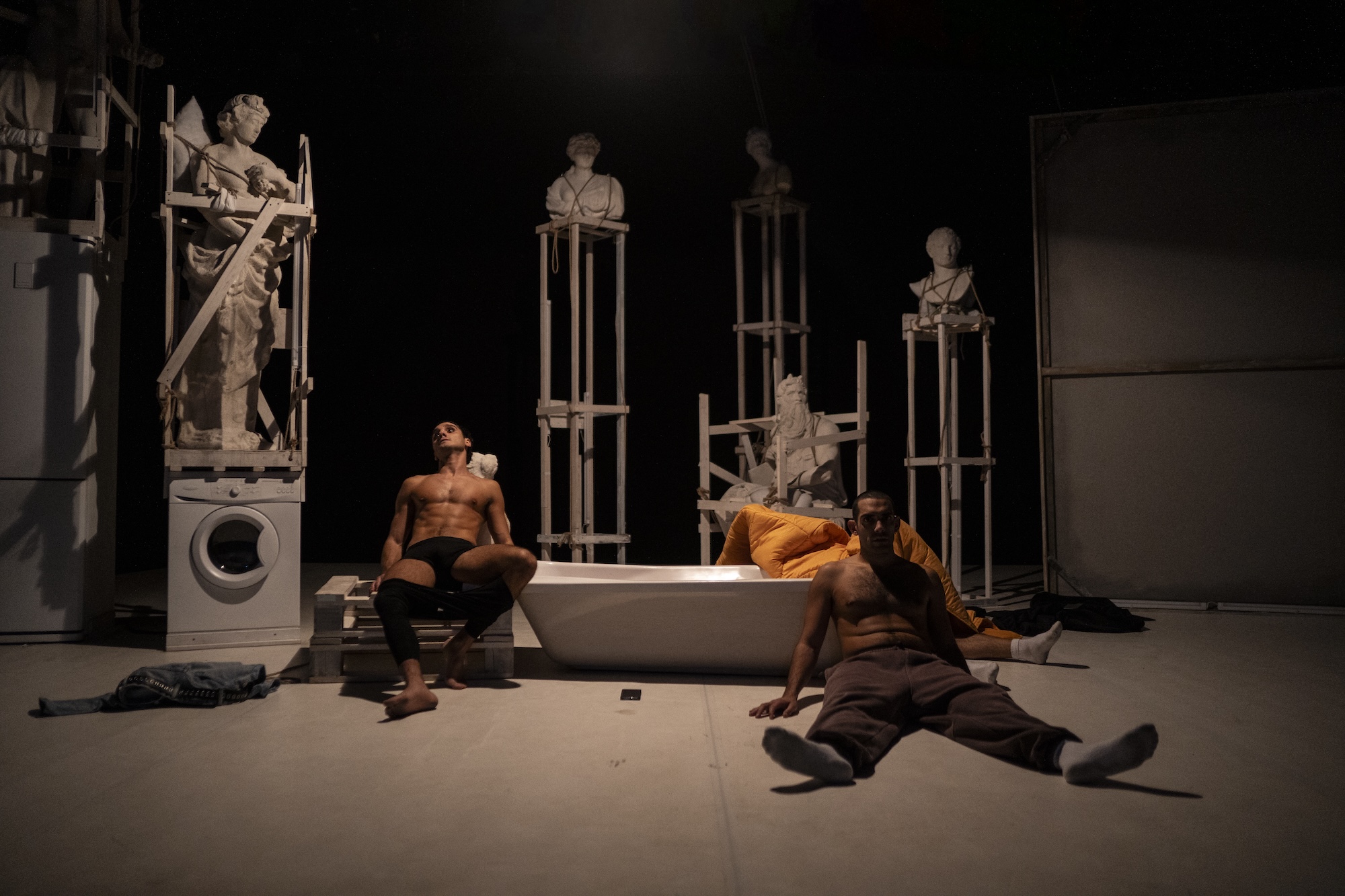 La scenografia al Teatro Fontana è il primo enigma: elettrodomestici e luci al neon si fondono a statue di gesso dal sapore antico, collocate in alto come presenze che osservano. Sembrano in fase di restauro e i quattro interpreti le spostano e ci giocano. È Roma? La grande bellezza che si fonde con la malinconica ordinarietà delle case di periferia e l’illuminazione fredda delle strade. Sergio Leone, Daniele Di Pietro, Pietro De Tommasi e Cristian Zandonella ci giocano, danzano con la storia con disinvoltura.